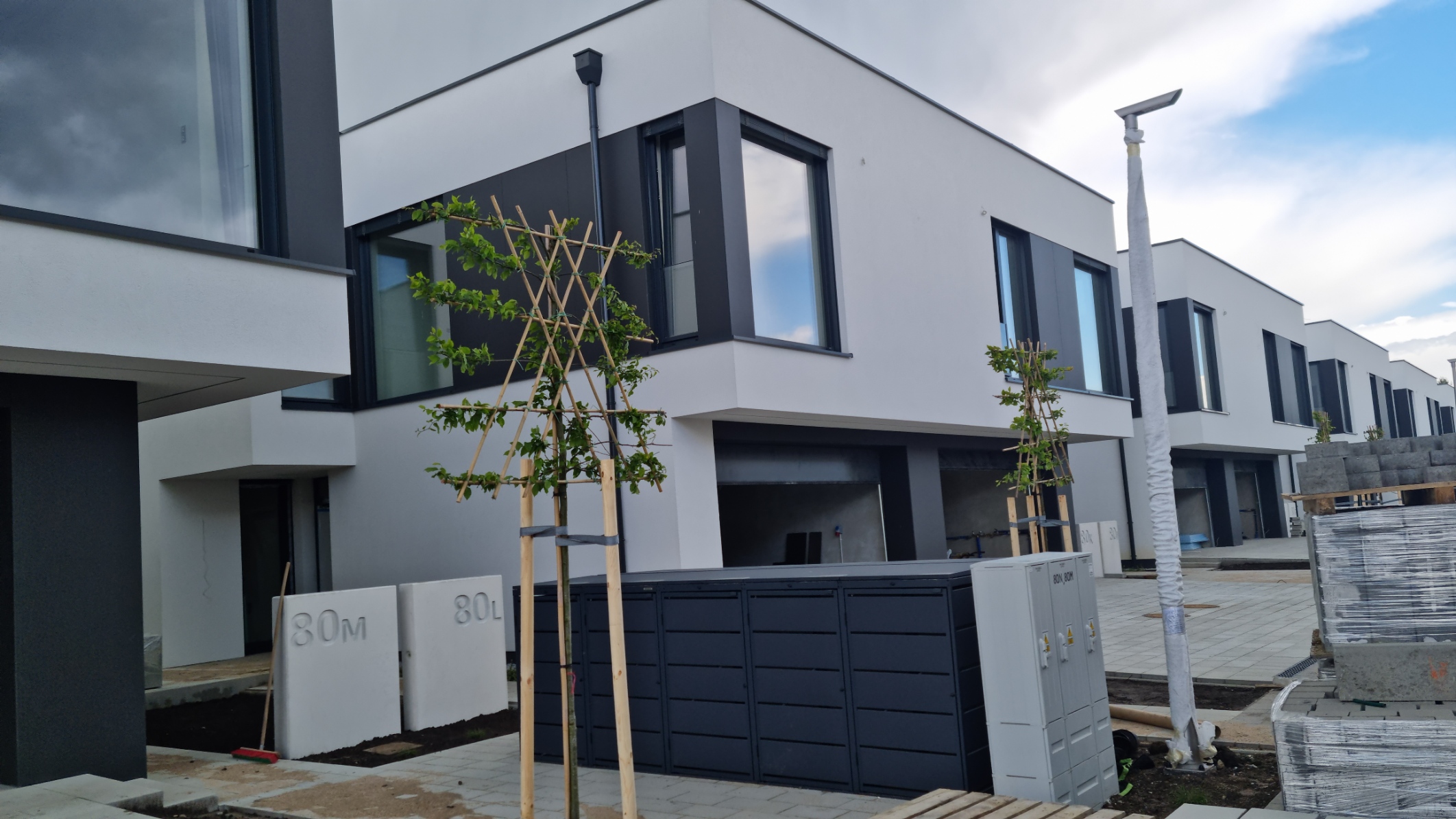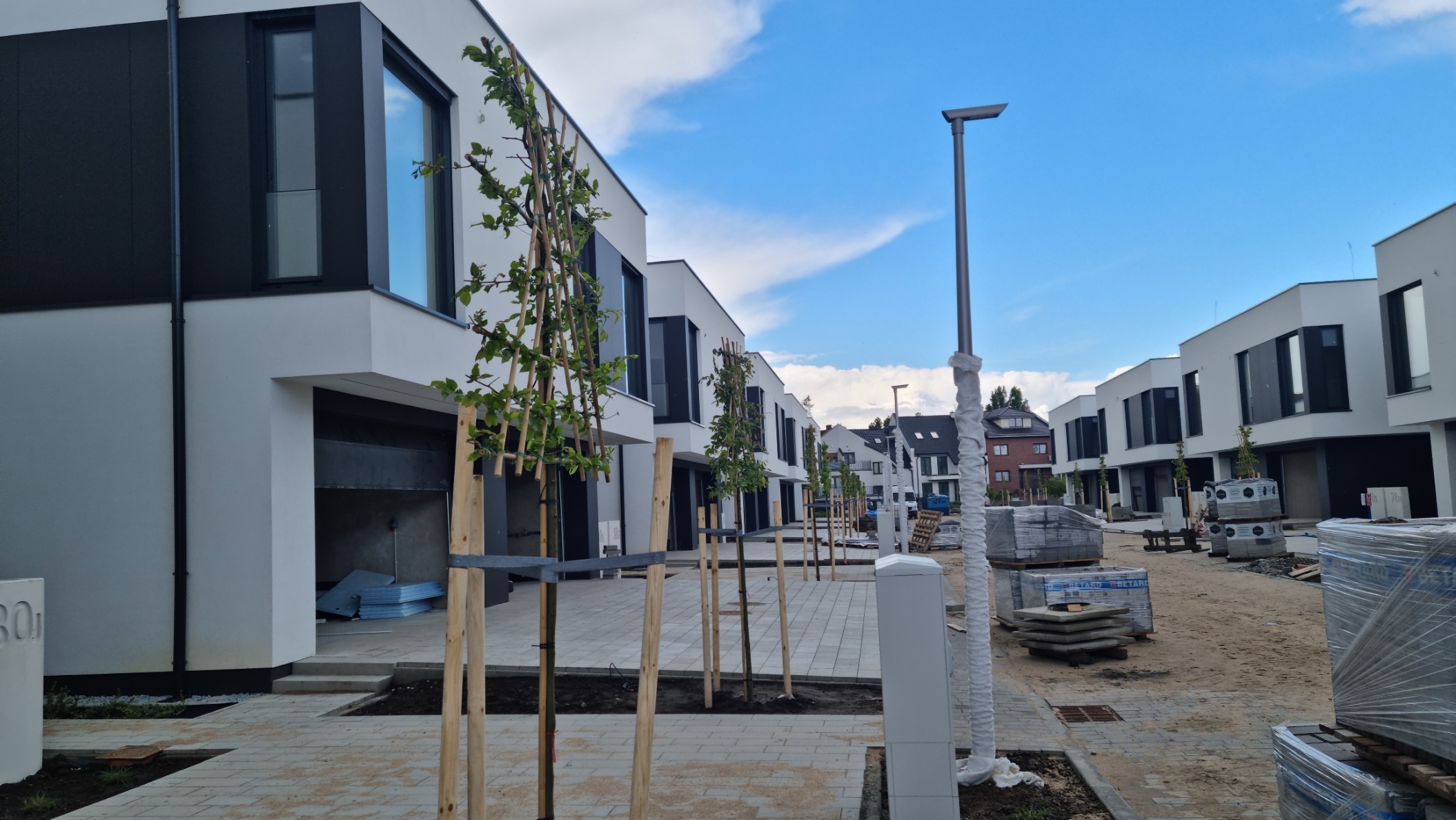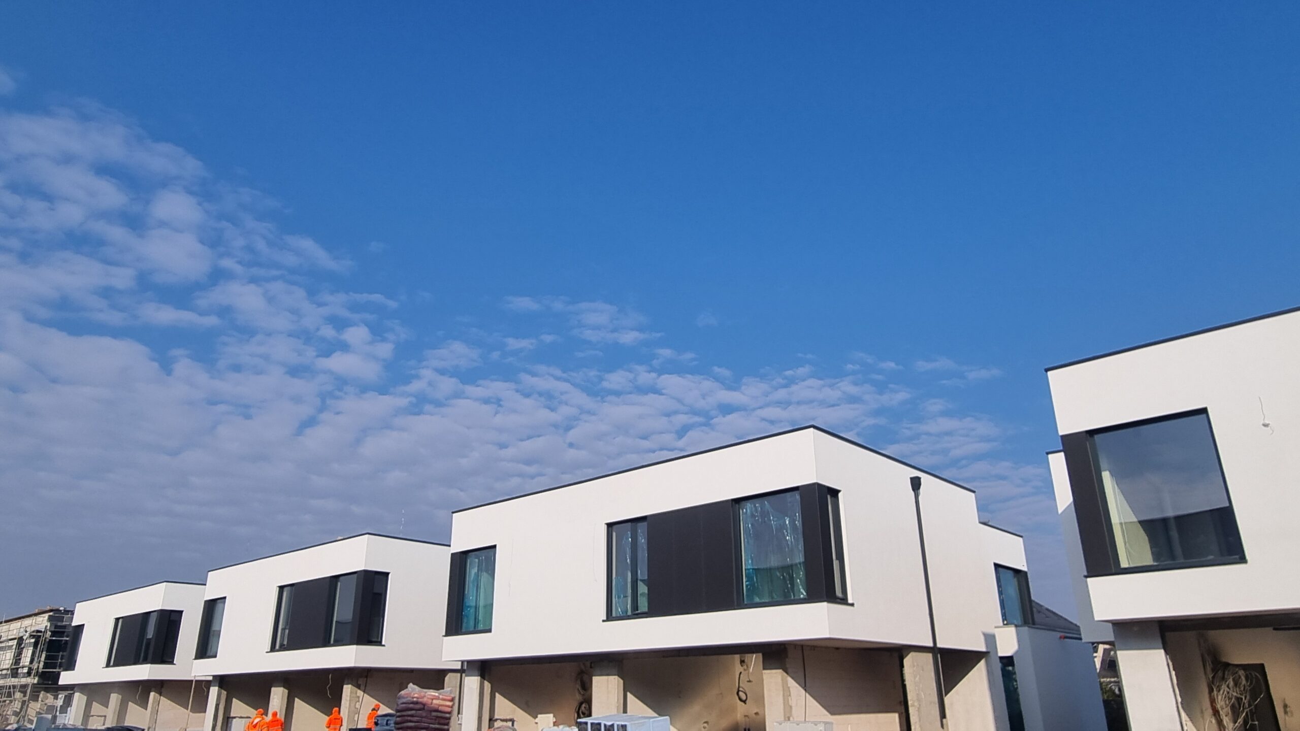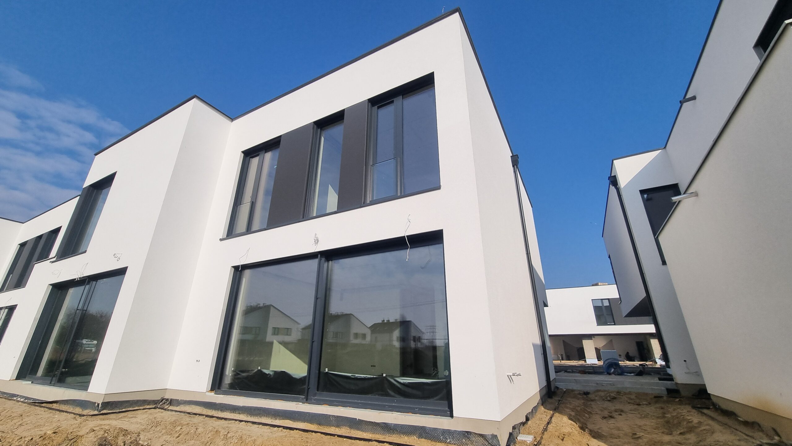 Bramy garażowe i drzwi wejściowe z naświetlami. Całość w eleganckim kolorze. Południowa część osiedla prawie gotowa